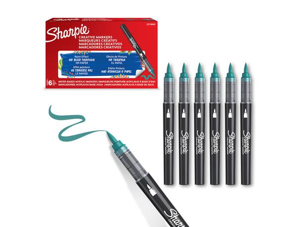 "Sharpie® Brush' Marqueurs Créatifs | Pointe Pinceau | Largueur du trait : minimum 1.2 mm | Marqueur opaque à débit d'encre instantané, sans dégorgement | Surfaces d'application : papier, métal, bois, céramique, verre, roche, toile, y compris sur les surfaces sombres et claires ! | Encre Acrylique | """GREEN""" Vert Emeraude | Boîte de 6"