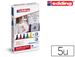 marqueur textile e4500 et e4600. Marqueur à encre pigmentée à base d'eau pour décorer presque tous les textiles : coton, soie, lin, etc. Corps plastique. Encre très résistante à la lumière et séchage rapide, pour un résultat efficace. Repassez pour fixer. Votre décor devient pratiquement indélébile au lavage jusque 60°C. Pochette de 5 coloris : noir, rouge, bleu, vert et jaune. Fourni avec un mini tee-shirt pour tester les marqueurs.