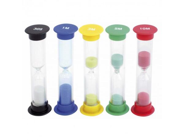 Chaque sablier a une couleur de sable et une durée différente. Contenu : 5 sabliers (3 s, 1 min, 3 min, 5 min et 10 min)