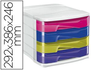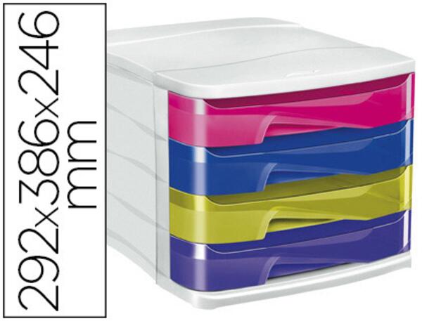 En polystyrène antichoc. Décor contrastant mat et brillant. Tiroirs pour des documents jusqu'au format A4 +, que ce soit des feuilles, des chemises-dossiers ou des chemises à élastique. Tiroirs équipés d'une butée d'arrêt. Patins antidérapants fournis. Tiroirs multicolores amovibles. Dimensions : 292 x 386 x 246 mm.