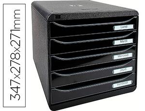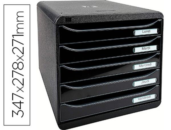 "Caisson individuel à 5 tiroirs pour documents au format A4 +. Monobloc, ultra-rigide. Superposable grâce à 4 reliefs. Coulissement des tiroirs, avec butée de sécurité et porte-étiquettes. Fourni avec un jeu d'étiquettes """Lundi à Dimanche""". Dimensions : 347 x 278 x 271 mm. Produit certifié Ange Bleu."