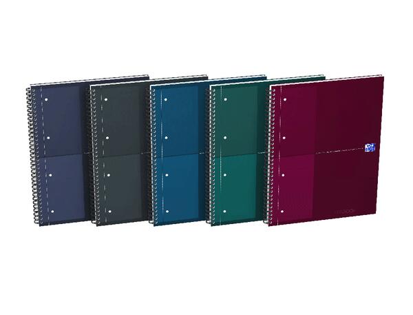 NOTEBOOK OXFORD INTERNATIONAL INTEGRALE et 4TROUS 230x295 160P OPTIK P. couleurs assorties : Noir Gris, Bleu Foncé, Vert, Pétrole, Bordeaux dimensions : 24x29,6x1 COUVERTURE : La couverture en carte rigide et rembordée est très résistante. Elle protège efficacement les pages. RELIURE : La reliure double spirale est résistante et permet une ouverture du cahier à 360°, pour un maximum de flexibilité et de confort pendant l'utilisation. PERFORATIONS : Les feuilles se détachent facilement grâce aux micro-perforations sur le côté. Grâce à ses perforations de 4 trous vous pourrez les insérer aisément dans un classeur. Une fois les feuilles détachées, de ce cahier A4+, celles-ci sont au format A4 (21cm x 29,7cm). REGLURE : La réglure petits carreaux 5mm dispose d'un en-tête pour identifier facilement votre contenu en indiquant un titre et une date , ainsi qu'une double marge pour faire des annotations. OPTIK PAPER : un papier unique, créé par OXFORD qui empêche l'encre de traverser, d'u