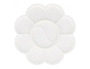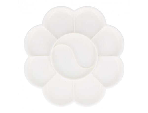 Palette en plastique blanche en forme de fleur. Avec 10 sections, plus un au centre. L'unité - Dim. (Ø) : 14 cm