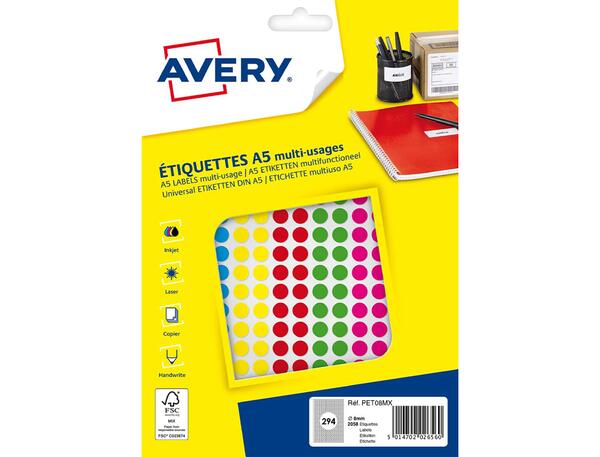 2058 pastilles bleues, jauness, rougess, vertes, roses, oranges, violettes Ø 8 mm, impression Laser, Jet d'encre, Copieur