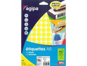 Pastilles jaune multi usage Ø 15 mm. Pochette 10 feuilles A5 multi-usage soit 960 pastilles. Adhésif permanent. Pour plusieurs utilisations : identifier, marquer le prix, signaler, etc. Ces étiquettes sont un produit idéal pour pouvoir imprimer facilement mais aussi pour l'écriture manuelle. Etiquettes adhésives APLI-Agipa compatibles avec les différentes imprimantes jet d'encre, laser et copieurs du marché : Epson, Canon, HP, Lexmark..... Aucun risque de bourrage grâce à l'adhésif résistant aux hautes températures.