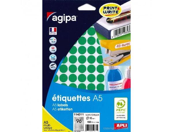 Pastilles verte multi usage Ø 15 mm. Pochette 10 feuilles A5 multi-usage soit 960 pastilles. Adhésif permanent. Pour plusieurs utilisations : identifier, marquer le prix, signaler, etc. Ces étiquettes sont un produit idéal pour pouvoir imprimer facilement mais aussi pour l'écriture manuelle. Etiquettes adhésives APLI-Agipa compatibles avec les différentes imprimantes jet d'encre, laser et copieurs du marché : Epson, Canon, HP, Lexmark..... Aucun risque de bourrage grâce à l'adhésif résistant aux hautes températures.