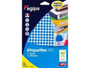 Pastilles bleu multi usage Ø 8 mm. Pochette 10 feuilles A5 multi-usage soit 2940 pastilles. Adhésif permanent. Pour plusieurs utilisations : identifier, marquer le prix, signaler, etc. Ces étiquettes sont un produit idéal pour pouvoir imprimer facilement mais aussi pour l'écriture manuelle. Etiquettes adhésives APLI-Agipa compatibles avec les différentes imprimantes jet d'encre, laser et copieurs du marché : Epson, Canon, HP, Lexmark..... Aucun risque de bourrage grâce à l'adhésif résistant aux hautes températures.