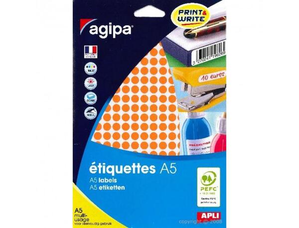 Pastilles orange multi usage Ø 8 mm. Pochette 10 feuilles A5 multi-usage soit 2940 pastilles. Adhésif permanent. Pour plusieurs utilisations : identifier, marquer le prix, signaler, etc. Ces étiquettes sont un produit idéal pour pouvoir imprimer facilement mais aussi pour l'écriture manuelle. Etiquettes adhésives APLI-Agipa compatibles avec les différentes imprimantes jet d'encre, laser et copieurs du marché : Epson, Canon, HP, Lexmark..... Aucun risque de bourrage grâce à l'adhésif résistant aux hautes températures.