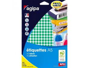 Pastilles verte multi usage Ø 8 mm. Pochette 10 feuilles A5 multi-usage soit 2940 pastilles. Adhésif permanent. Pour plusieurs utilisations : identifier, marquer le prix, signaler, etc. Ces étiquettes sont un produit idéal pour pouvoir imprimer facilement mais aussi pour l'écriture manuelle. Etiquettes adhésives APLI-Agipa compatibles avec les différentes imprimantes jet d'encre, laser et copieurs du marché : Epson, Canon, HP, Lexmark..... Aucun risque de bourrage grâce à l'adhésif résistant aux hautes températures.