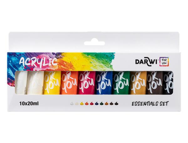 Set de 10x20ml peinture acrylique Darwi For You - Essentials Set. Pigments hautement concentrés et résistants à la lumière, qui confèrent à chaque couleur une profondeur, une intensité ainsi qu'une opacité et une couvrance incomparable. Texture onctueuse et effet satiné. Assortiment de 10 couleurs en tubes de 20ml. Dimension 25 x 123 x 240 mm - 300 gr