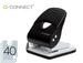 Partie supérieure en plastique et base métallique, avec base antidérapante en plastique. Ouverture de 4 mm, avec capacité de perforer jusqu'à 40 feuilles. Avec guide réglable pour aligner le papier. Dimensions de la base : 140 x 130 mm. Couleur noire.