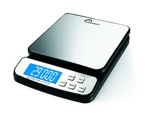 Pèse-colis électronique. Pèse-lettres et colis multifonctions. Fonction comptage, tare, hold (maintien de l'affichage). Fonctionne avec piles (fournies) ou sur secteur. Plateau inox : 262 x 180 mm. Capacité : jusqu'à 30 kg. Graduation par 1 g.