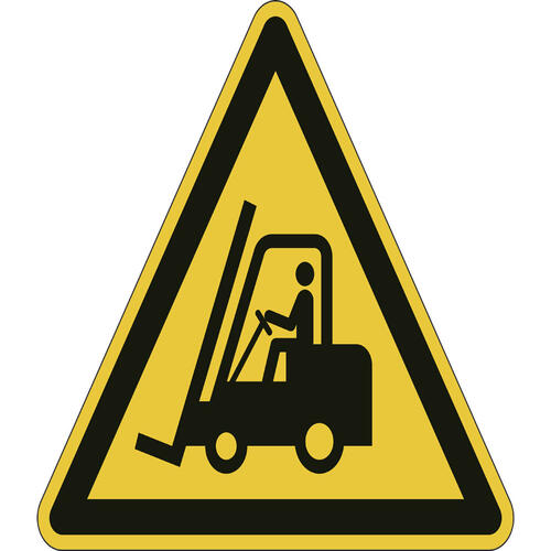PICTOGRAMME AU SOL 'ATTENTION CHARIOTS ÉLÉVATEURS' 430X430 MM ' Symbole : « Chariots élévateurs et autres véhicules industriels », W014 selon ISO 7010 ' Marquage de sécurité agréé autocollant, pour application sur les sols en intérieur, p. ex. dans des entrepôts, centres de distribution, halls de production, etc... ' Résistant à l'abrasion et à l'usure