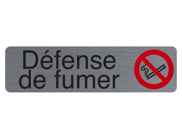 Plaque adhésive imitation aluminium Défenser de fumer 16,5X4,4 cm. Une bonne signalétique est indispensable pour indiquer et faire respecter les règles et les interdits. Ce panneau permet ainsi d'afficher clairement les consignes et règles à respecter afin d'assurer la sécurité et le bien être de chacun. Cette plaque imprimée sur un support d'épaisseur 0,8 mm, d'aspect aluminium brossé est auto-adhésive. Elle se fixe facilement et rapidement sur tous types de supports. Ce produit est vendu dans une cartonnette individuelle, recyclable et avec perfomation pegbordable.