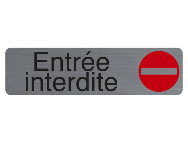 Plaque adhésive imitation aluminium éntrée interdite 16,5X4,4 cm. Une bonne signalétique est indispensable pour indiquer et faire respecter les règles et les interdits. Cette plaque permet par exemple de gérer les accès en interdisant certaines zones aux personnes non autorisées. Cette plaque imprimée sur un support d'épaisseur 0,8 mm, d'aspect aluminium brossé est auto-adhésive. Elle se fixe facilement et rapidement sur tous types de supports. Ce produit est vendu dans une cartonnette individuelle, recyclable et avec perfomation pegbordable.