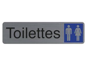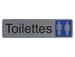 Plaque adhésive imitation aluminium Toilettes dame / homme 16,5X4,4 cm. Une bonne signalétique est indispensable pour guider et informer les usagers. Ce panneau permet ainsi d'orienter les usagers en balisant correctement les espaces clés, publics. Cette plaque imprimée sur un support d'épaisseur 0,8 mm, d'aspect aluminium brossé est auto-adhésive. Elle se fixe facilement et rapidement sur tous types de supports. Ce produit est vendu dans une cartonnette individuelle, recyclable et avec perfomation pegbordable.