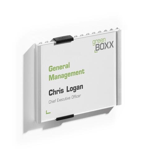 PLAQUE DE PORTE INFO SIGN - 149X105,5 MM Plaque de porte INFO SIGN en acrylique/aluminium Remplacement facile des inserts en carton en faisant coulisser l'écran acrylique Convient pour une utilisation dans les bureaux, salles de conférence, halls d'entrée et bien d'autres locaux représentatifs À visser ou à coller Kit de montage, gabarit de perçage et mode d'emploi inclus Pour insertions bristol 149 x 105,5 mm Embouts supplémentaires (n° d'art. 4816) disponibles séparément Personnalisation possible avec planches d'insertions imprimables (réf. 485102)