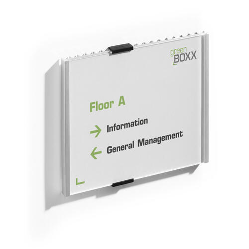 PLAQUE DE PORTE INFO SIGN - 210X148,5 PAYSAGE Plaque de porte INFO SIGN en acrylique/aluminium Remplacement facile des inserts en carton en faisant coulisser l'écran acrylique Convient pour une utilisation dans les bureaux, salles de conférence, halls d'entrée et bien d'autres locaux représentatifs À visser ou à coller Kit de montage, gabarit de perçage et mode d'emploi inclus Pour insertions bristol : 210 x 148,5mm Embouts supplémentaires (n° d'art. 4816) disponibles séparément Personnalisation possible avec planches d'insertions imprimables (réf. 485502)