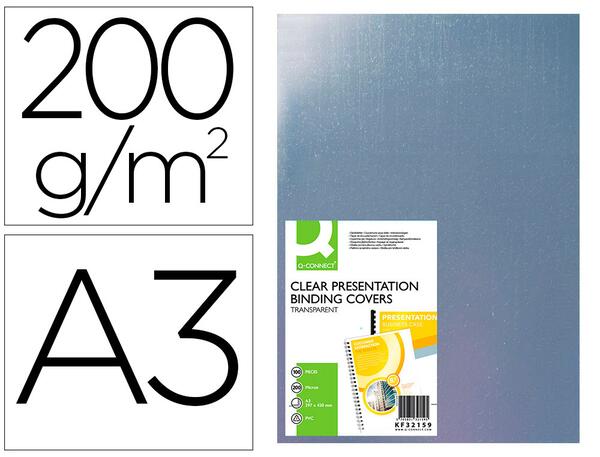 Plat de couverture en PVC de différentes épaisseurs et formats pour relier avec spirales, peignes à relier, anneaux et autres. Paquet de 100 unités. Coloris : Incolore', 'A3, 200 microns.