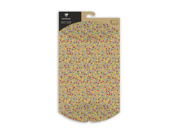 Pochette cadeau, Multicolors, pliable, pour offrir des objets et accessoires, à plier soi-même. Design : petits pois sur fond kraft, boite cadeau aux motifs pétillants, idéale pour emballer un cadeau à Noël ou lors d'un annivesaire. Dimensions : 30x40x10 cm.