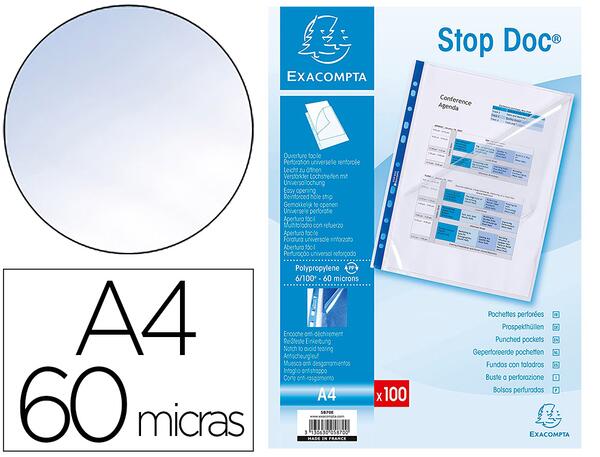 En polypropylène lisse 6/100ème. Ouverture en coin pour une insertion facile des documents. Perforation 11 trous. Pour format A4. Lot de: 100 pochettes.