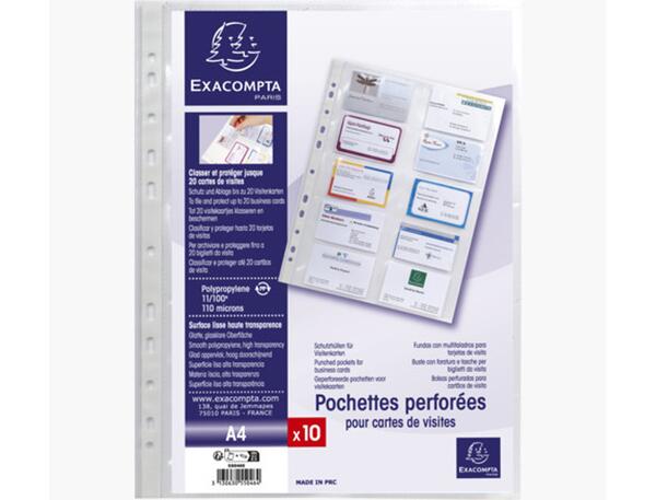 Sachet de 10 pochettes perforées pour cartes de visite 10 emplacements - polypropylène lisse 11/100e - A4. Idéal pour ranger des cartes de visites. 10 emplacements soit 20 cartes de visites par pochette. Surface lisse haute transparence.