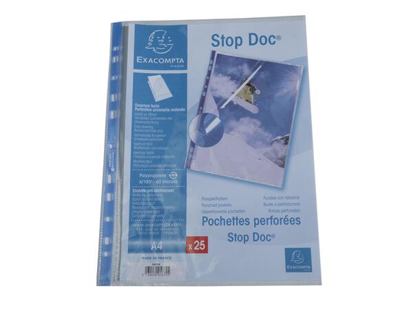 Sachet de 25 pochettes perforées Stop doc ouverture en coin - polypropylène lisse 6/100e - A4. Pochette soudée sur un tiers de la hauteur : permet une insertion facile et rapide des documents tout en assurant un parfait maintien des documents. Surface lisse haute transparence. éncoche anti-déchirement et bande de renfort des perforations bleue.