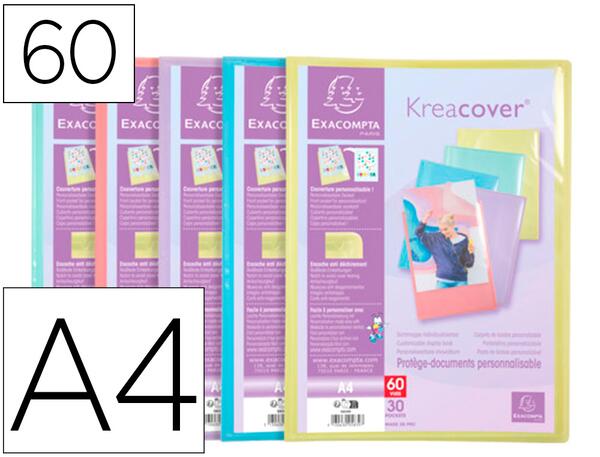 Protège-documents en polypropylène transparent. Couverture souple translucide 5/10ème avec pochette de personnalisation. Pochettes cristal lisse haute transparence. Coloris assortis : bleu pastel, corail, jaune, mauve, vert pastel.