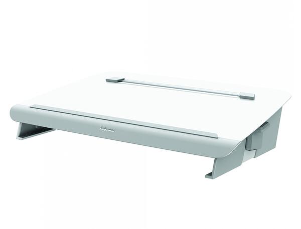 Plateforme permettant d'adopter une posture idéale en travaillant avec des documents. 5 niveaux de réglage. Plateau coulissant vers l'avant. Espace de rangement et de chargement intégré. Coloris blanc.
