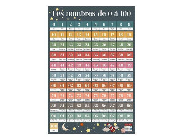 Poster pédagogique les Nombres de zéro à cent en lettres et en chiffres. Support souple pelliculé effaçable à sec. Format : 52 x 76 cm Poids : 150 g