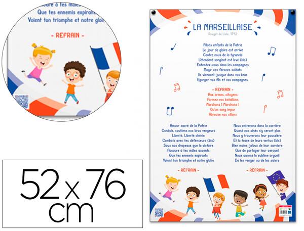 "Poster pédagogique """Marseillaise enfant""" : produit ludique spécialement conçu pour un apprentissage facile de la Marseillaise pour les enfants ' Flash code pour écouter l'hymne national de la France. Souple pelliculé effaçabe à sec pour une meilleure résistance à l'usage. Dimensions : 52 x 76 cm"