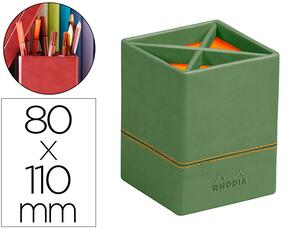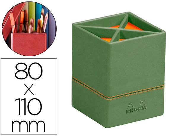 En simili cuir italien haut de gamme. Au toucher velouté avec logo Rhodia embossé et piqûres sellier orange élégantes et coordonnées à l'intérieur du pot. Convient aux vegans Avec ses quatre compartiments astucieux, il permet de séparer stylos, feutres, surligneurs, marqueurs et autres crayons. Dimensions : 80 x 80 x 110 mm. Produit certifié PEFC.