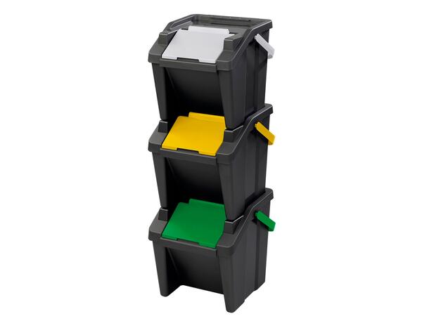 Lot de 3 poubelles de tri sélectif pour déchets (papier, plastique, biodéchets) Capacité : 30L Couvercles amovibles avec clapets colorés. Empilables : parfaites pour les petits espaces. Emboîtables pour un volume réduit lors du transport et du stockage. Pratiques pour aller vider le contenu grâce à la anse de transport. Fabriqué avec 80% de matière recyclée (le corps de la poubelle). Dimensions : 38,2 x 37,6 x H 37cm. Hauteur de la pile : 107 cm. Poids : 4,35 kg.