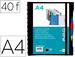 Fabriqué en polypropylène souple et résitant. Format A4. Couverture de 60/100ème. Avec 40 pochettes de 7,5/100ème amovibles. Couverture personnalisable. Comprend 5 séparateurs colorés et une pochette enveloppe permettant de stocker des documents A4, des notes, des cartes, etc. Fermeture avec élastique. Coloris noir opaque.