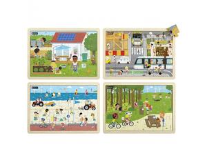 À reconstituer avec ou sans le modèle. Des illustrations riches et colorées imprimées sur le bois. Modèle amovible recto verso : couleurs ou noir et blanc. Avec cadre. Le lot de 4 puzzles de 28 et 35 pièces : le jardin, la ville, la mer et la forêt