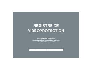 Couverture rigide. Réglure imprimée avec garde-titre et numéro d'autorisation, personne responsable des enregistrements, liste des caméras, dates et heures d'enregistrement avec leur date de destruction ou de transmission au parquet en cas d'évènement notable. Format A4 horizontal. 104 pages.