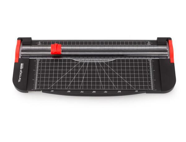 Machine à découper le papier, le carton argileux, le vinyle et les photos. La capacité de coupe va jusqu'à 12 feuilles (papier standard 80 g) au format DIN A4 (longueur max. : 31 cm). Rogneuse légère avec lame trapézoïdale protégée dans la tête de coupe pour une grande sécurité. Impression sur table avec lignes de coupe et plaque de mesure d'angle rabattable.