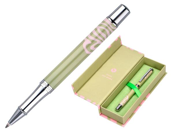 Rollercorps en aluminium vert matcha avec des ondulations rose pastel. Attributs argent. Encre noire. Pointe 0,7 mm. Tracé 0,5 mm. Livré dans un élégant coffret cadeau avec fermeture magnétique.