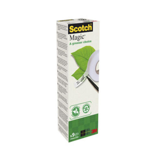 Ruban adhésif invisible écologique. Film à base d'acétate de cellulose (issu de la pâte à bois). Adhésif à base d'eau. Bague en carton 100 % recyclé, packaging en carton 100 % recyclé, fabriqué dans une usine certifiée ISO 14001. Ruban de 19 mm x 33 m.