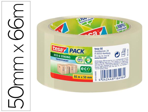 En polypropylène 100% recyclé. Adhésif premium de fermeture cartons très solide permettant un emballage sécurisé. Mandrin carton 100% recyclé. Masse adhésive acrylique sans solvant. Résistance élevée aux UV. Résiste aux températures extrêmes de -15 à + 65 ºC. Épaisseur : 56 microns. Déroulement silencieux. Pouvoir adhésif jusqu'à 15 kg. Dimensions : 66 m x 50 mm. Normes : Ecolabel européen.