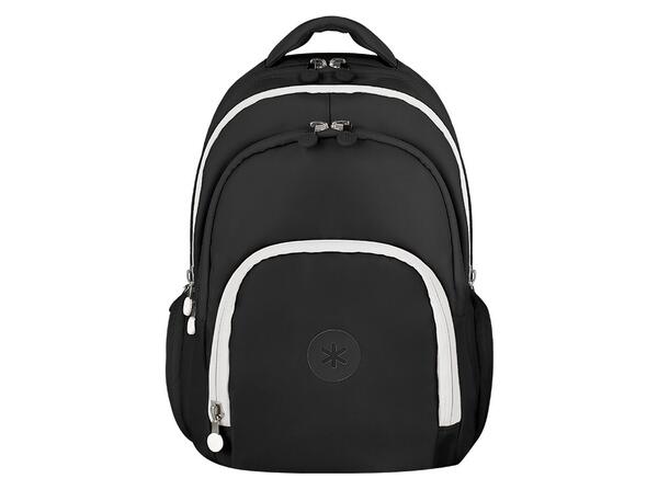 "Sac à dos 3 compartiments en polyester résistant et déperlant. Le grand compartiment est équipé d'un séparateur pour ordinateur portable jusqu'à 15""".De très nombreux rangements avec sa poche frontale complémentaire et ses 2 poches latérales toutes avec fermeture éclair. Anse de préhension. Sangle de bagage. Bandes réfléchissantes sur les bretelles. Dimensions : 45 x 16 x 30 cm. Capacité : 19 litres. Garantie : 3 ans. Coloris noir."