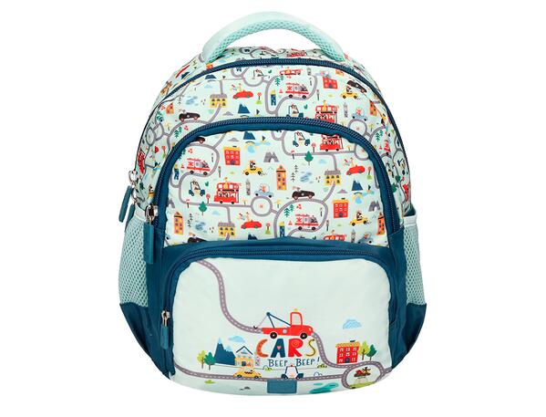 Sac à dos avec plusieurs compartiments qui facilitent le rangement et l'organisation : 1 grand compartiment central, un 2ème compartiment de taille moyenne, 1 poche avant avec petite poche intérieure avec fermeture éclair et 2 filets élastiques latéraux pour des bouteilles. En polyester résistant et imperméable. Bretelles rembourées réglables et dos rembouré ergonomique. Bandes réfléchissantes sur les bretelles et à l'avant. Anse de préhension rembourée pour plus de confort. Fermetures éclair très résistantes. Capacité : 10 litres. Dimensions : 35 x 11 x 27 cm. Coloris vert d'eau avec bretelles et fermetures éclair bleu canard et motifs autour de la voiture et de la circulation.