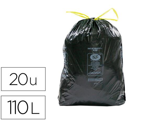 Sacs poubelle à liens coulissants. Les liens coulissants permettent un gain de remplissage pouvant aller jusqu'à 20% de plus qu'un sac ordinaire. Le lien coulissant vous simplifiera la fermeture de ceux-ci. Épaisseur : 45 microns. Coloris noir. Capacité : 110 L. Rouleau de 20 sacs.