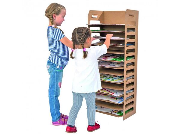 14 dessins peuvent être placés simultanément. Les étagères sont en carton imperméable. Livré à plat. Dim. (L x P x H) : 43 x 33 x 110 cm