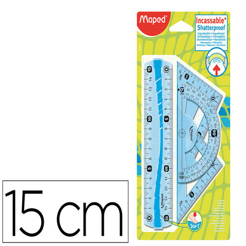 Le kit de traçage incassable qui résiste à tout ! 4 outils de traçage durables et pratiques. Le kit de traçage contient : une règle 15 cm incassable, graduée sur les deux côtés. L'équerre 60° et l'équerre 45° sont graduées sur deux longueurs. Le rapporteur 180° possède une base de 10 cm et un repérage optimisé du centre. Tous les instruments de géométrie nécessaires aux collégiens et lycéens. Lignes droites, angles droits et angles géométriques, n'auront plus de secrets pour eux. Adapté pour les cartables surchargés. Coloris aléatoire : bleu ou vert.
