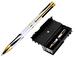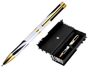 Stylo-bille corps en aluminium noir avec des zébrures blanches. Attributs or. Encre bleue. Pointe 1 mm. Tracé 0,5 mm. Livré dans un élégant coffret cadeau avec fermeture magnétique.