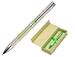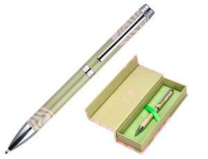 Stylo-bille corps en aluminium vert matcha avec des ondulations rose pastel. Attributs argent. Encre bleue. Pointe 1 mm. Tracé 0,5 mm. Livré dans un élégant coffret cadeau avec fermeture magnétique.