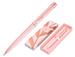 Stylo-bille corps rose en aluminium avec des attributs or rose. Encre bleue. Pointe 1 mm. Tracé 0,5 mm. Livré dans élégant coffret cadeau assorti.