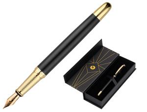 Stylo-plume noir en aluminium avec des détails et attributs or. Encre bleue. Pointe M.Tracé 0,5 mm. Livré dans un élégant coffret cadeau décoré à l'intérieur et à fermeture magnétique