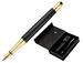 Stylo-plume corps enaluminium brossé noir avec attributs or. Encre bleue. Pointe moyenne. Tracé 0,5mm. Livré dans un élégant coffret cadeau décoré à l'intérieur et qui contient un étui en simili cuir avec une fermeture par bouton pression doré.